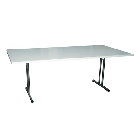 Tavolo con ripiano in nobilitato e gambe pieghevoli in metallo cromato tubolare.